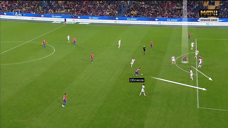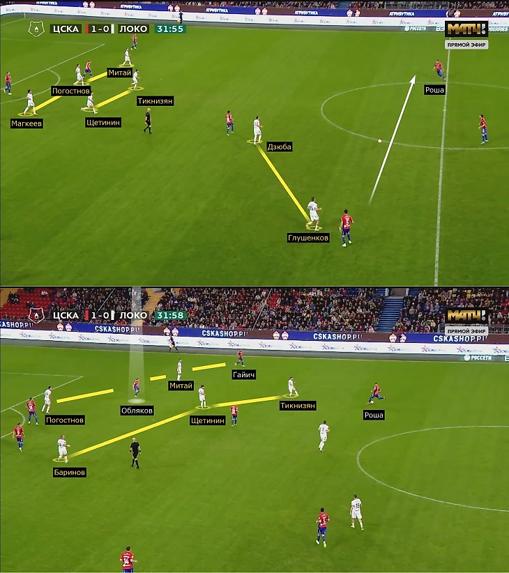 Наглядная демонстрация – шанс Заболотного после классного паса Облякова. Сначала ЦСКА легко отсек пару нападающих (перед Рошей – гектар свободного пространства), а затем создал условия, при которых Митай разрывался между Гайичем и Мединой, Тикнизян бросался на блок, а компактность между Бариновым и Щетининым нарушена.
