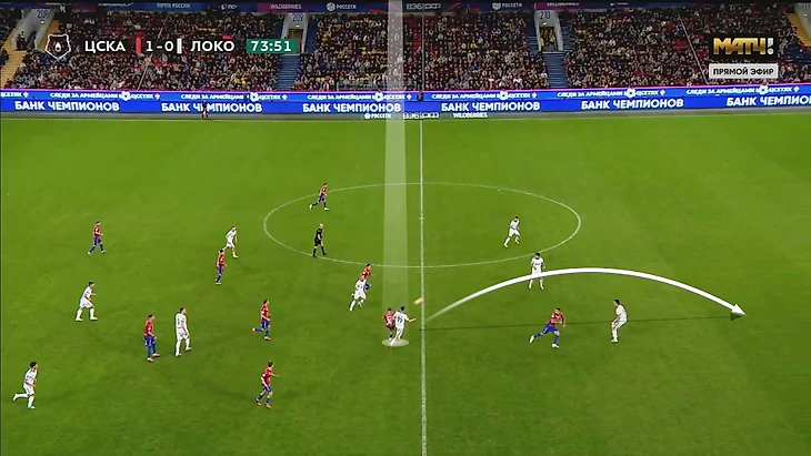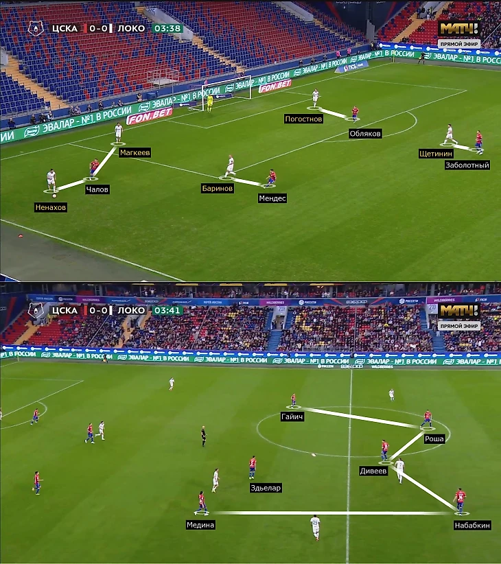 Но основная возможность «Локо» – фланговая игра. Между розыгрышами от ворот со стремлением Лантратова играть длинными передачами (плюс была подстройка от ЦСКА) и контролем мяча центральными защитниками в средней трети – огромная разница. При владении Погостнова и Магкеева атакующая тройка располагалась узко (Заболотный был над инсайдами), а Тикнизян и Ненахов оставались свободными. Это заставляло Медину и Гайича подниматься чуть выше (перекрыть направление передачи, но оставить вингеров за спиной) или оставаться в пятерке (как раз возможность для подключений КЗ «Локо»).
