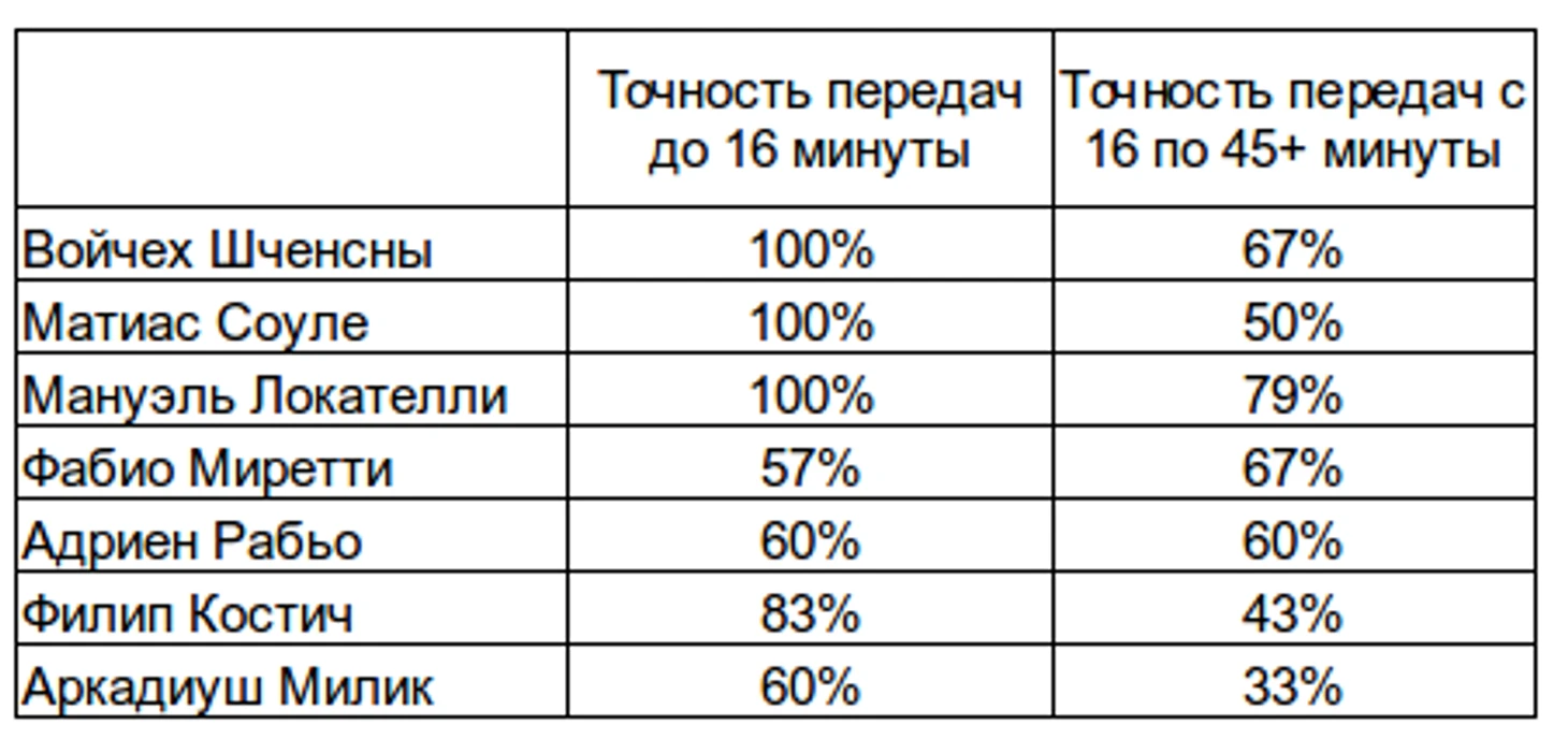 После отрезка более-менее равного владения «Наполи» просто раздавил «Ювентус». Владении мячом с 16 минуты до конца первого тайма: 23%-77% в пользу гостей. Атакующая активность команды Спаллетти позволила на этом отрезке времени нанести 3 удара по воротам Щенсного (все 3 заблокированы). «Наполи» стал гораздо активнее в прессинге, стало больше единоборств и гости чаще забирали подборы. На этом отрезке времени у «Ювентуса» просто расклеилась игра в пас. До 16 минуты точность передач составляла 85% у хозяев и 89% у гостей. До перерыва цифры показатели «Ювентуса» радикально изменились - 73%. Ниже представлены цифры отдельных игроков: