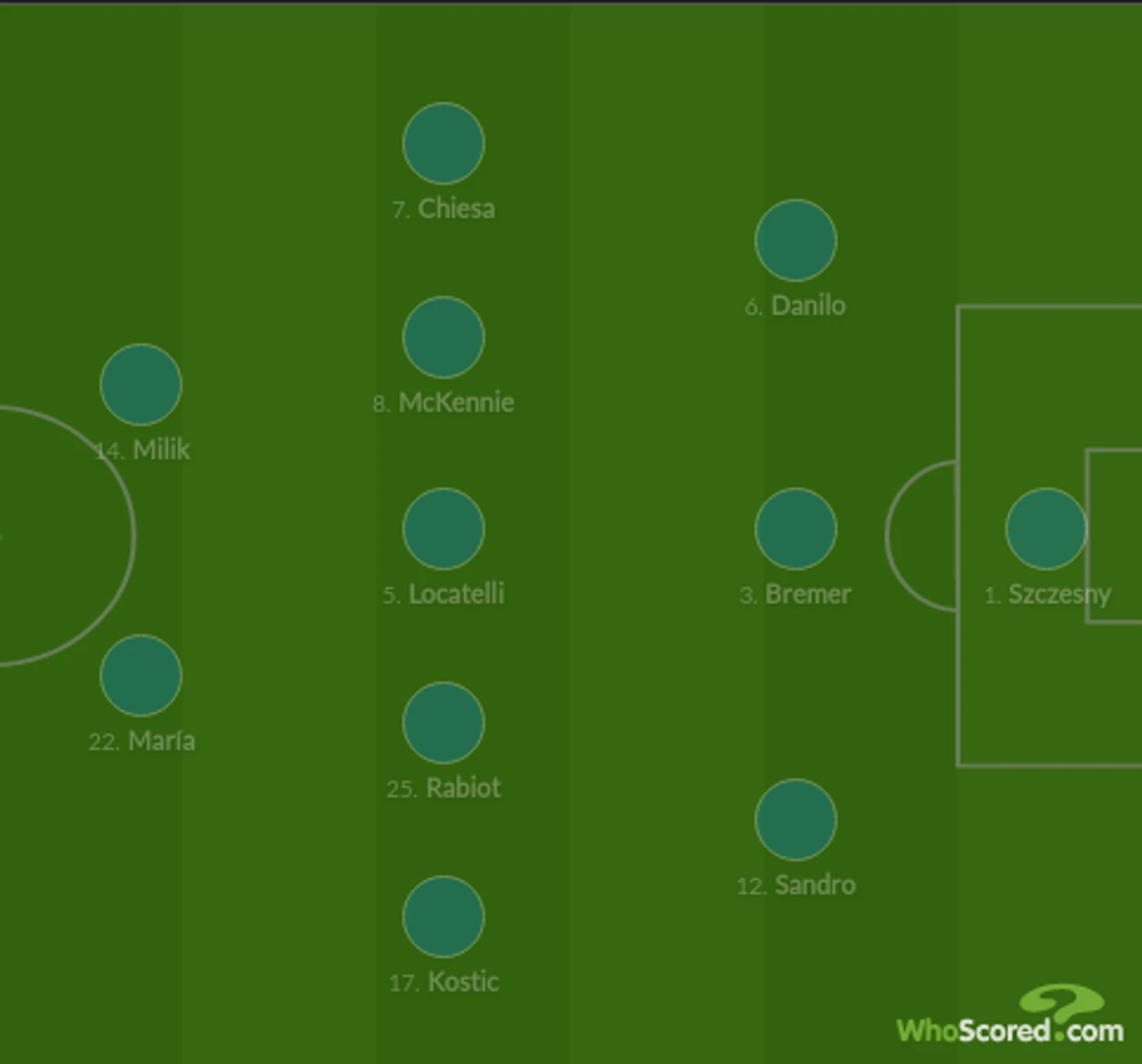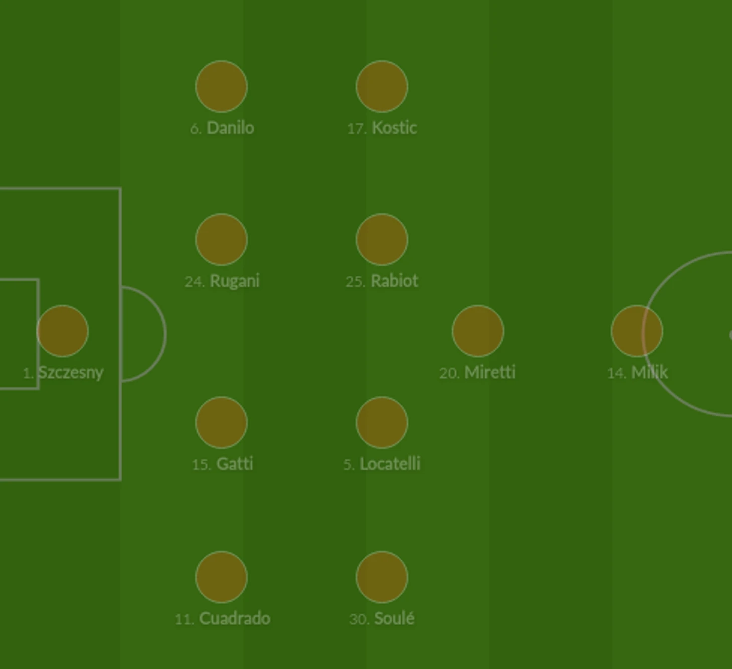 На вчерашний матч команда вышла с четверкой защитников: Ругани и Гатти были центральными, а Данило и Куадрадо – фланговыми. Выше оборонительной линии располагалась четверка Костич-Рабьо-Локателли-Суле, Милик играл нападающего, а место под ним занял Фабио Миретти. Получилось 4-4-1-1.