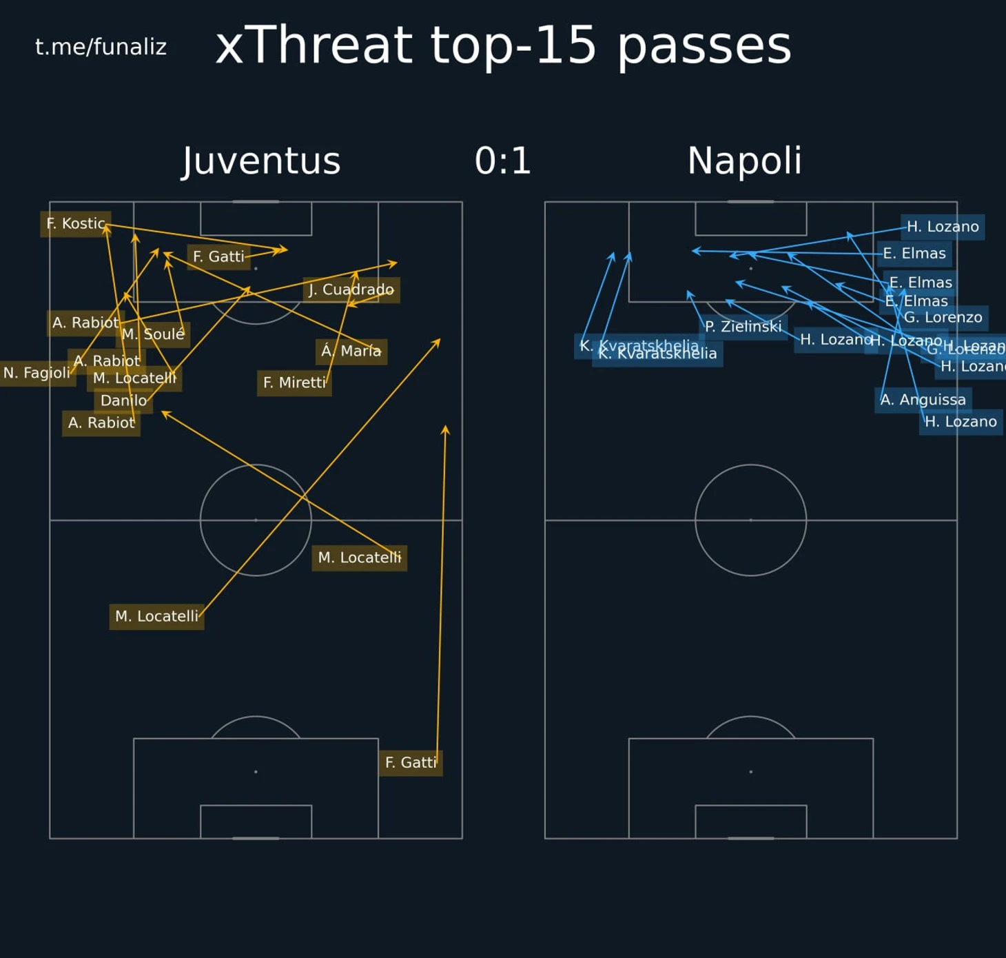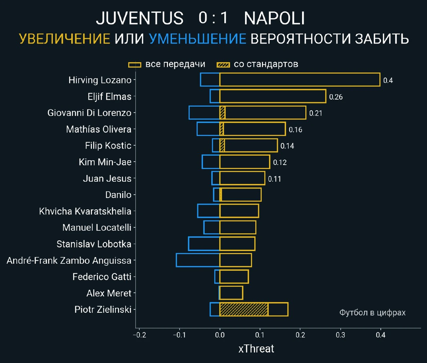 В первом тайме вчерашнего матча гости чаще задействовали левый фланг, однако после перерыва акцент атак переместился на правый. Как итог, лидерами «Наполи» по показателю xThreat с игры (ожидаемая угроза передач) оказались Ирвинг Лосано, Элиф Элмас и Джованни Ди Лоренцо – игроки правого фланга.