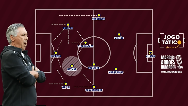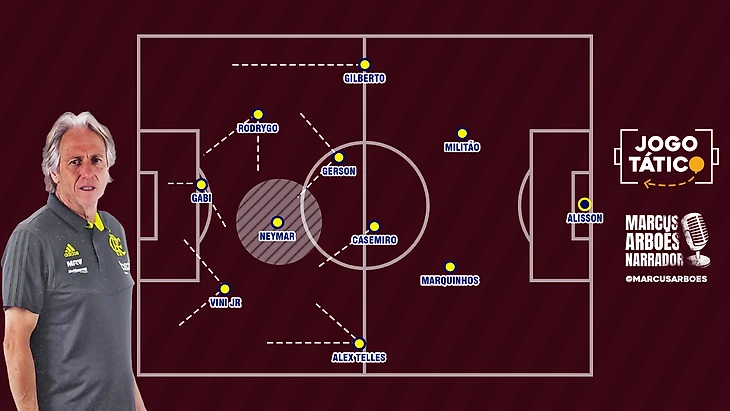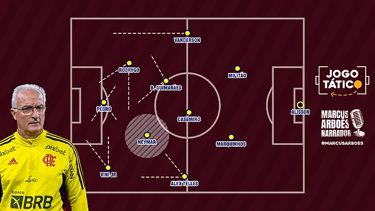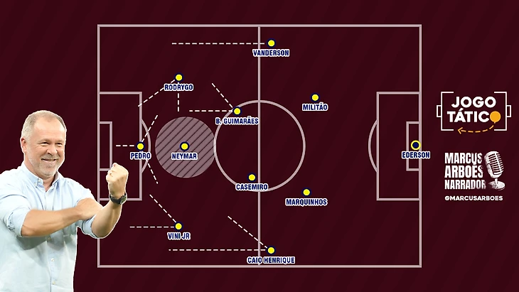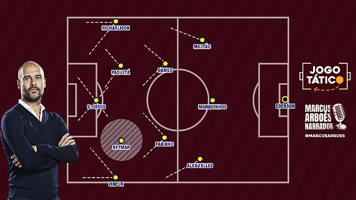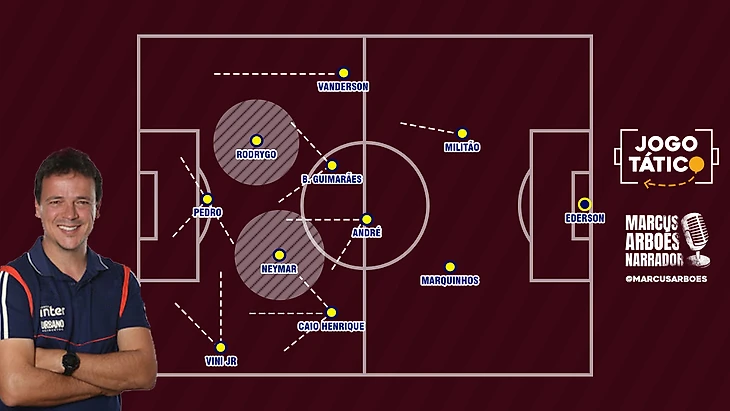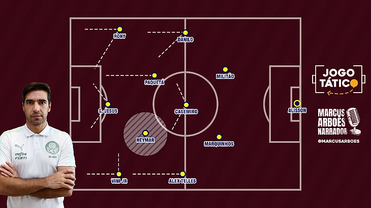 Абел Феррейра. Типично для себя консервативно на флангах со стартовыми 4-3-3, которые в атаке преобразуются в 4-2-4, как в Палмейрасе. Габи Жезус в постоянном движении и со сменой мест с Рони. Пакета контролирует территорию, а Неймар в роли Вейги. Обычный позиционный стиль.