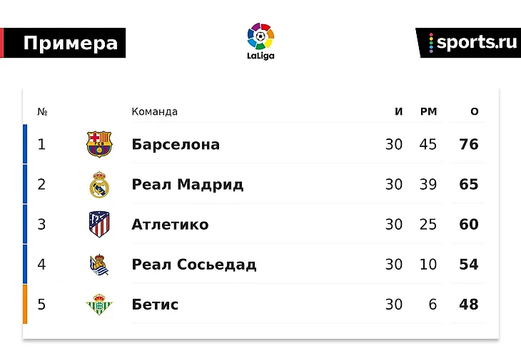 У мадридцев было 13 матчей без поражений – пока команда Диего Симеоне не приехала на «Камп Ноу». «Барса» выиграла 1:0 и упрочила шансы на чемпионство. «Атлетико» по сути гарантировал себе топ-4 и еще может побороться с «Реалом» за серебро.