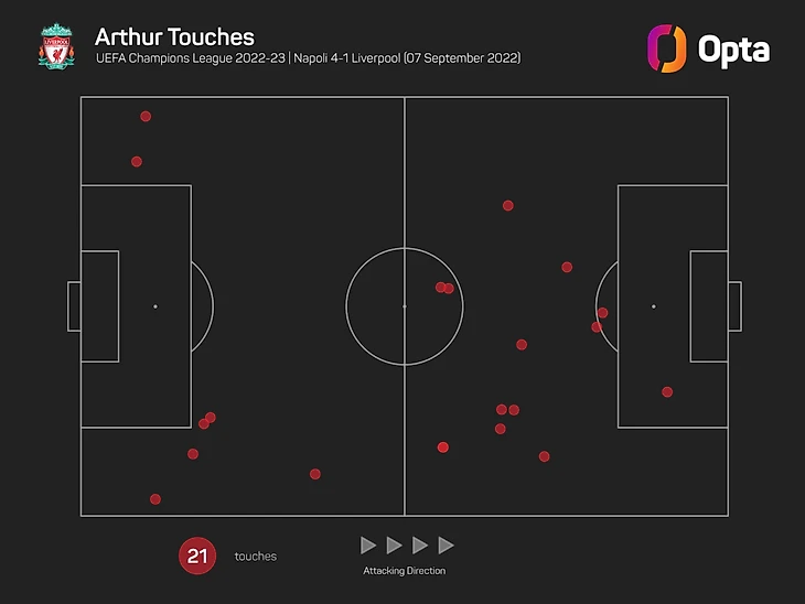 Он был на скамейке запасных в матче против «Эвертона» через два дня после того, как приехал в Мерсисайд, а затем заменил Харви Эллиотта в неудачном матче против «Наполи», выполнив 11 из 13 своих передач в моментально забываемой 13-минутной эпизодической роли. В общей сложности он коснулся мяча 21 раз — в то время он и не подозревал, что это будут его единственные касания в футболке «Ливерпуля».