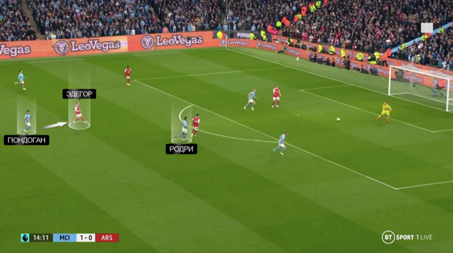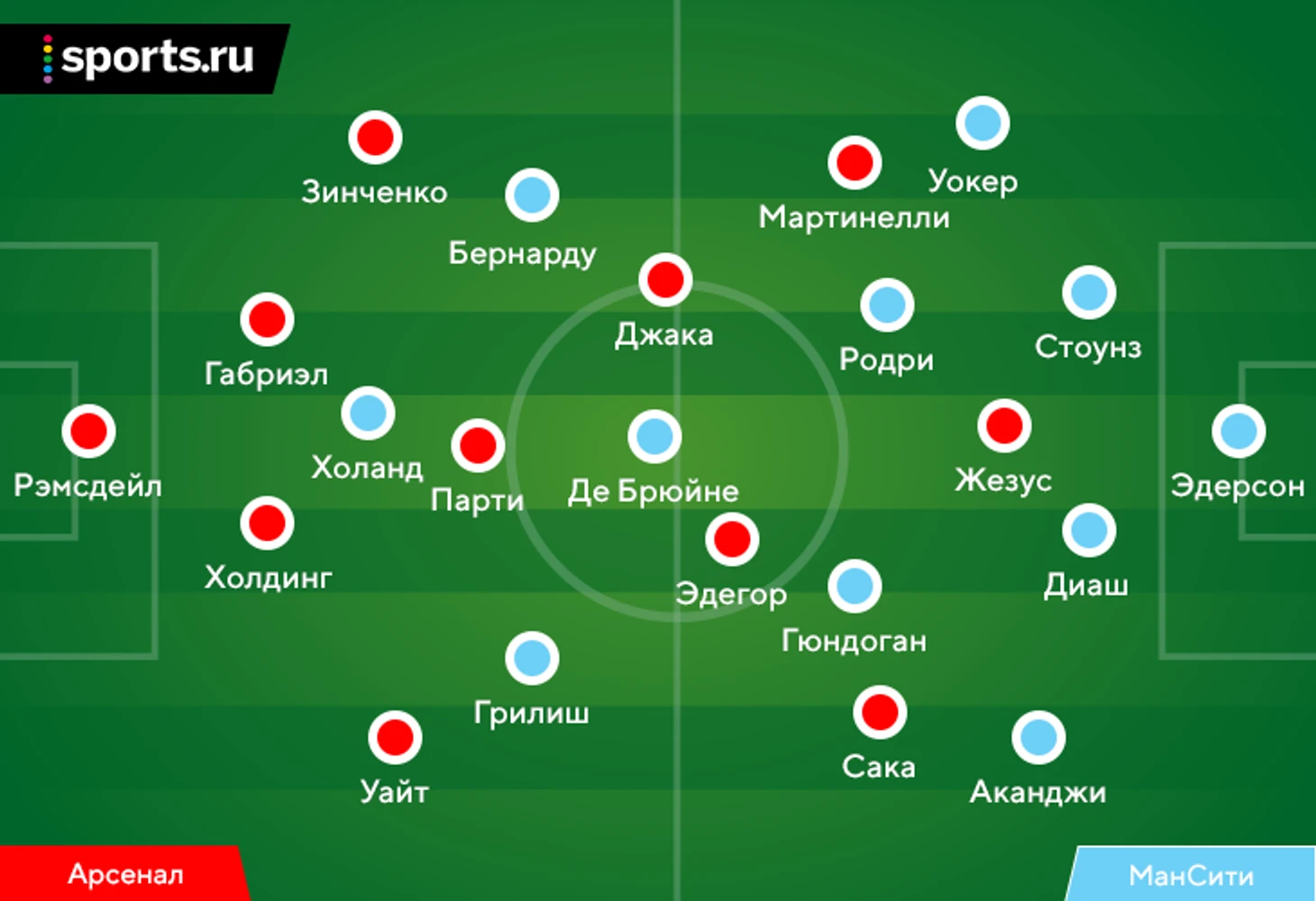 Решение Гвардиолы запутало «Арсенал» – изначально гости собирались давить персонально. Для этого поднимались пять человек (атакующая четверка + Гранит Джака) – видимо, под классику «Сити» этого сезона. Из-за того, что у хозяев было на одного игрока больше в этой стадии, пятерки часто не хватало – особенно когда «Сити» подключал Эдерсона: