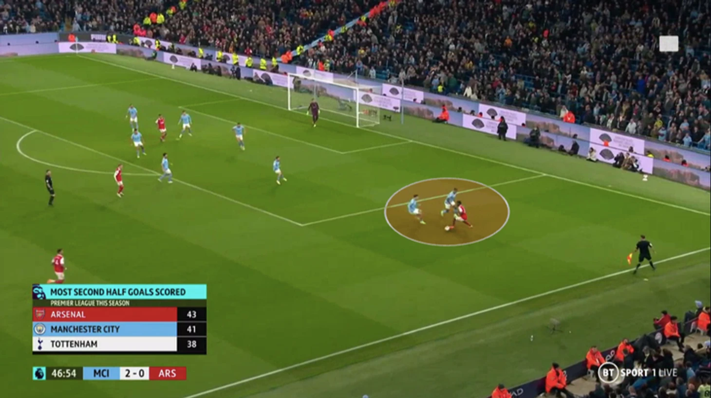 После заброса на Холанда образуется ситуация 4-в-4. Габриэл проигрывает единоборство Эрлингу, а Холдинг не успевает вернуться (находился рядом с Джеком Грилишем) и подстраховать: