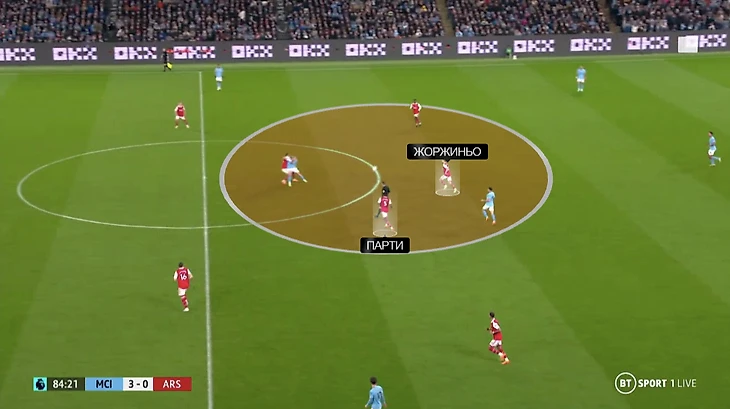 Попытка Артеты минимизировать ущерб проявилась и в игре без мяча, и при владении. «Арсенал» реже шел в активное давление – старался по максимуму перекрыть опорную. Жоржиньо помогал в этом процессе – шел в прессинг, но вовремя возвращался к Парти: