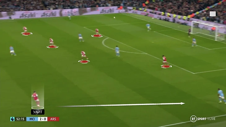 Еще одна беда – отсутствие подстраховки у защитников. Тут в прессинг у «Арсенала» выдвигается шесть человек (атакующая четверка + Джака + Бен Уайт) – чтобы накрыть новую структуру «Сити»: