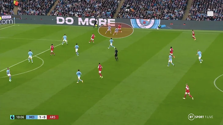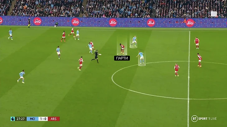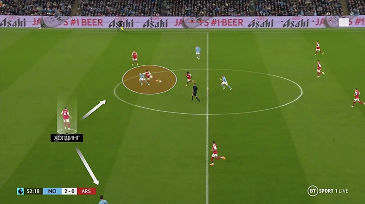 Если «Арсенал» все равно выдвигался в прессинг или начинал давить большими силами, «Сити» использовал длинные забросы в сторону Холанда. Тут проблемой «Арсенала» была огромная зона, которую приходилось покрывать Томасу Парти. Чтобы перекрыть «Сити» варианты для розыгрыша, Джака выдвигался максимально высоко, оставляя на Парти огромное пространство. Проблема проявилась перед первым голом «Сити»: