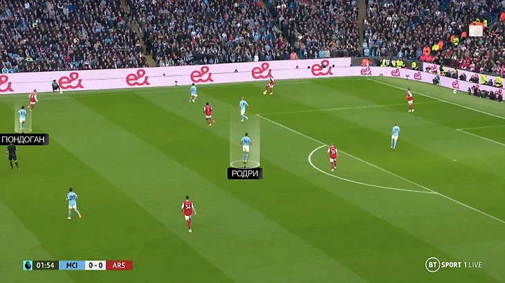 Против «Арсенала» «Сити» постоянно поддерживал уязвимый фланг. «Сити» прессинговал зонно, но держа в уме проблемы, которые могли создать Эдегор и Сака. При давлении на чужой половине применяли вариант, при котором Родри оказывается в прессинге выше Илкая Гюндогана (обычно – наоборот). Немец оставался поглубже для сдерживания Эдегора, который здорово находит пространство и за счет открываний рушит прессинг соперника: