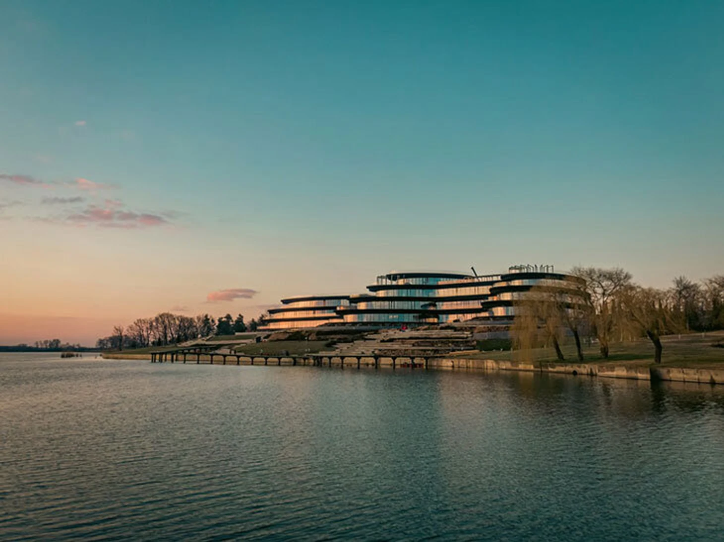 При виде корпусов у меня возникли ассоциации с лайнером, с кораблем. Яхтой, спущенной на воду. Форма такая, будто здания плывут. Вода усиливает эффект».