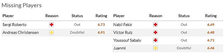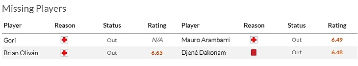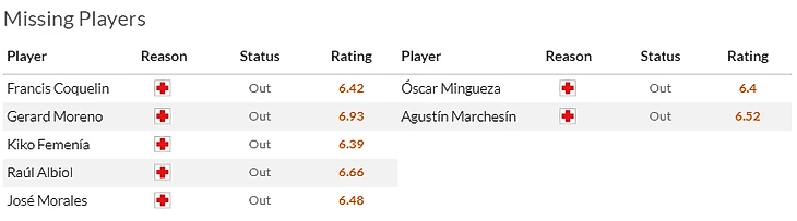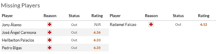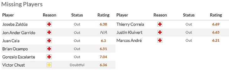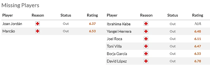 Хозяевам сейчас пригодится любая помощь, потому как из-за травм не сможет принять участие в игре основной защитник Фали(5,5), а выход на поле Рохера Марти(6,5), Хорхе Мере(5,5) и Гонсало Эскаланте(6) до сих пор остается под вопросом. Что касается гостей, то им возможно придется обойтись в воскресенье без не до конца здорового Кастильехо(7).