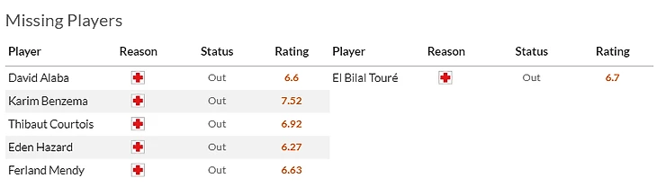 На что обратить внимание: На Карима Бензема(10). Французский форвард получил передышку в игре с Жироной и уже вернулся в общую группу. А вот относительно состояния здоровья Асенсио(8), Куртуа (6,5) до сих пор остаются вопросы. Зато про Модрича(7,5) все ясно: хорватский плэймейкер приболел и этот тур проаускает.