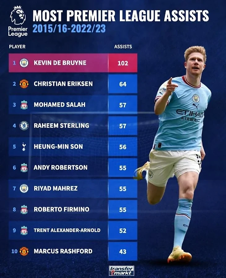 Ближайший преследователь − Кристиан Эриксен, который за это время сыграл за три клуба − «Тоттенхэм», «Брентфорд» и «Юнайтед», сделал «всего» 64 ассистов. Это на 7 больше, чем у занявших третье место Мохамеда Салаха из «Ливерпуля» и Рахима Стерлинга из «Челси» − по 57.