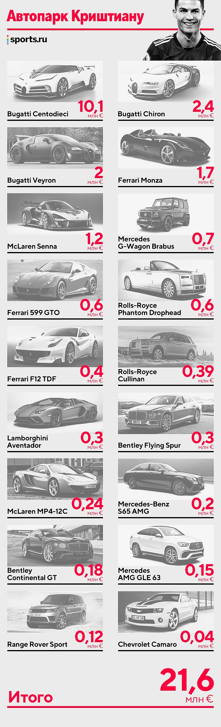 Следующий вопрос, который нас интересует, это у кого же самый большой автопарк? Так вот, победу в данной номинации одерживает Криштиану Роналду, в его гараже находится аж 18 шикарных авто. Вы только гляньте на этот список: 3 «Bugatti» общей стоимостью в 15 млн евро (среди которых самая быстрая в мире «Veyron»), «Ferrari Monza», «McLaren Senna», «Mersedes Brabus», несколько «Ройсов», «Ламба», «Bentley», Range Rover и другие.