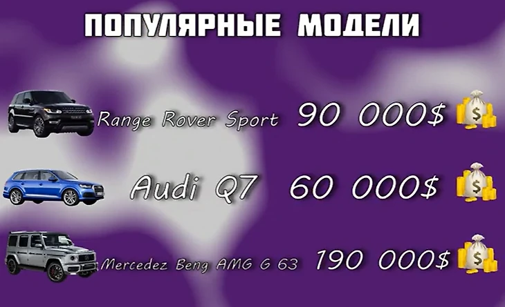 Если говорить о самых часто покупаемых моделях, то вот Вам топ-3: «Range Rover Sport», «Audi Q7» и «Mercedez Beng AMG G 63». Если захотите приобрести, примерная цена представлена ниже.