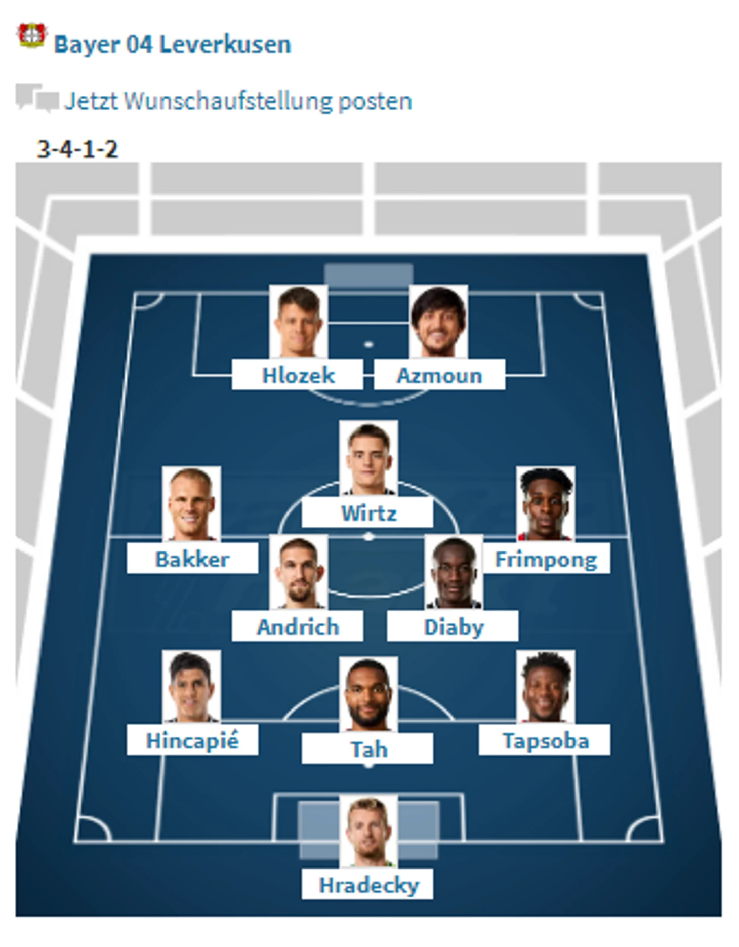 B04: Hradecky - Kossounou, Tah, Tapsoba - Frimpong, Andrich, Demirbay, Hincapie - Diaby, Wirtz, Adli