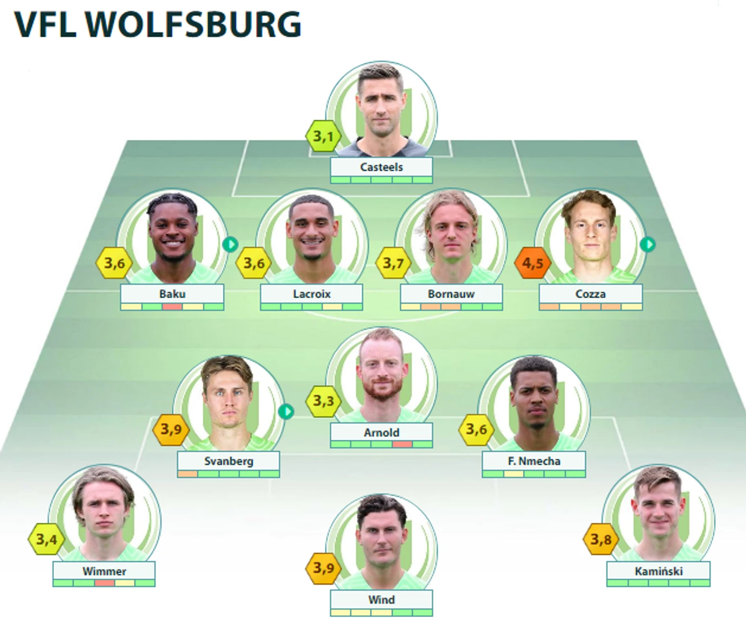 WOB: Casteels - Fischer, Bornauw, Lacroix, Cozza - Arnold - Svanberg, F. Nmecha - Wimmer, Kaminski - Wind