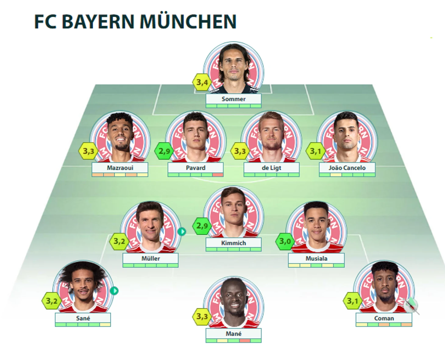 FCB: Sommer - Pavard, Upamecano, de Ligt, Cancelo - Kimmich, Goretzka - Coman, Musiala, Sane - Müller