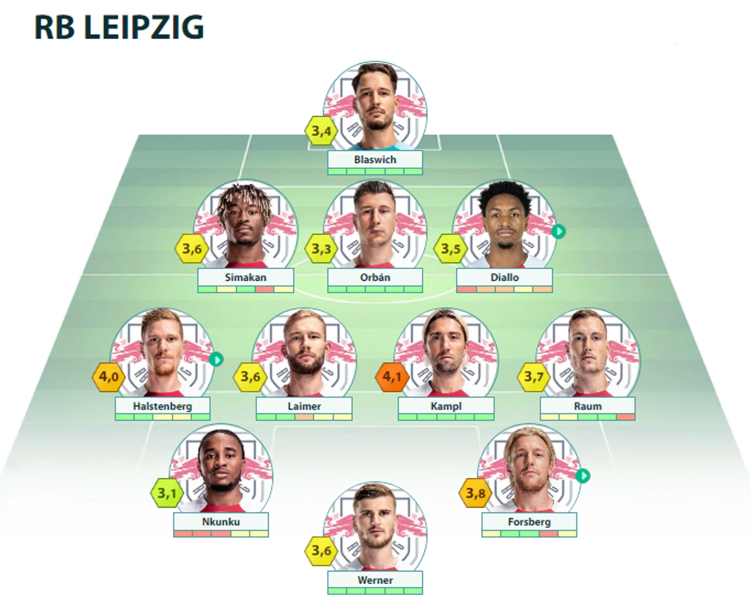 RBL: Blaswich - Simakan, Orban, Gvardiol - Henrichs, Laimer, Kampl, Halstenberg - Olmo, Nkunku - Werner