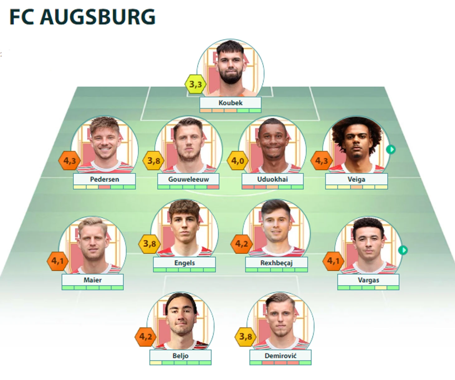 FCA: Koubek - Gumny, Gouweleeuw, Uduokhai, Pedersen - Engels, Rexhbecaj - Maier, Vargas - Beljo, Demirovic