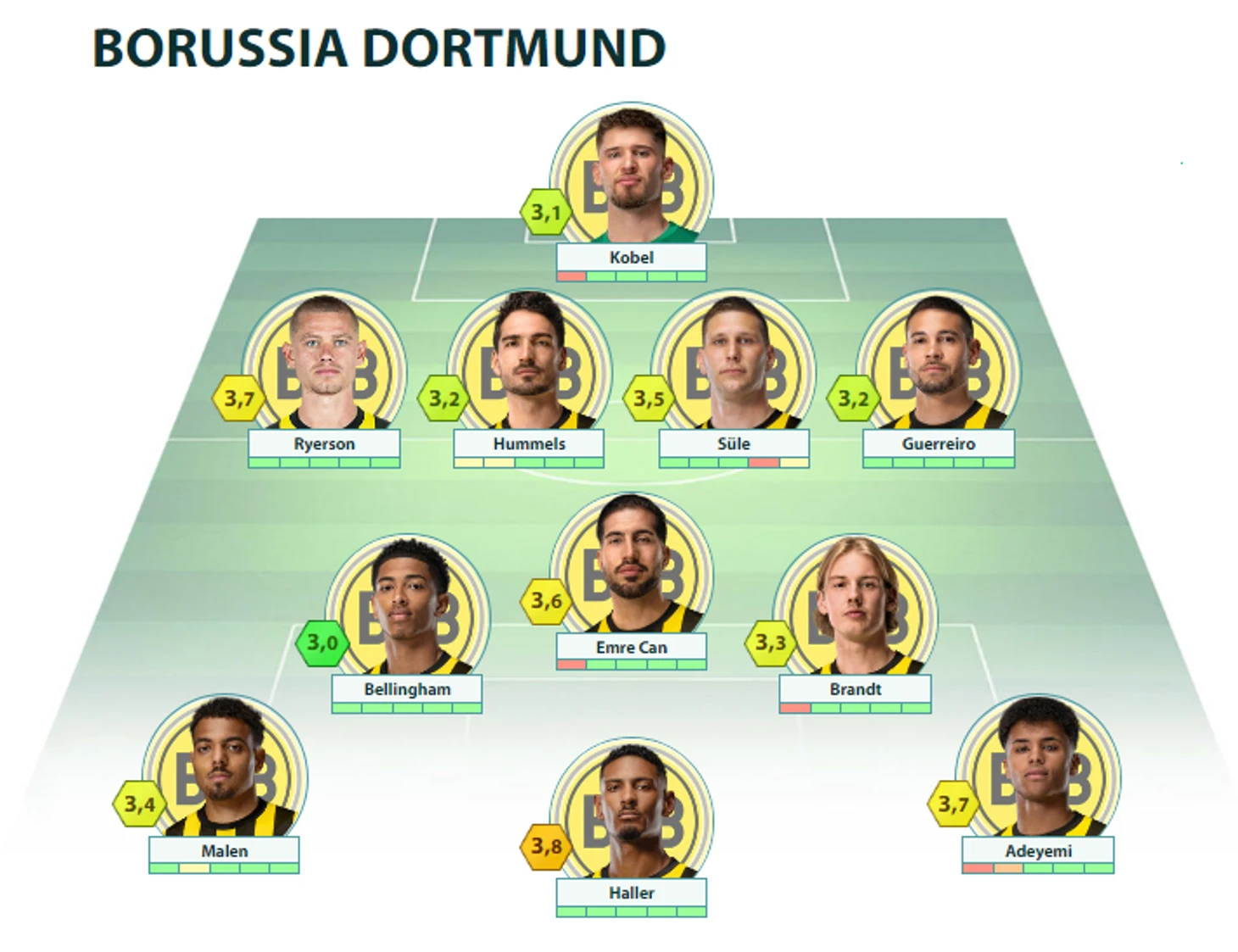 BVB: Kobel - Ryerson, Süle, Hummels, Guerreiro - Can - Bellingham, Brandt - Malen, Adeyemi - Haller