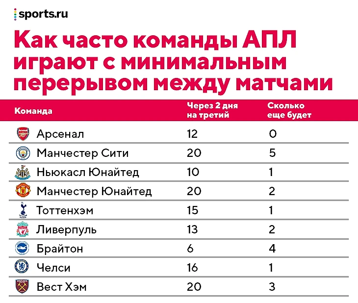 У команды тен Хага действительно непростое расписание. Мы посчитали, сколько раз команды АПЛ в этом сезоне играли в режиме «через два дня на третий» – у «МЮ» набралось 20 таких матчей.