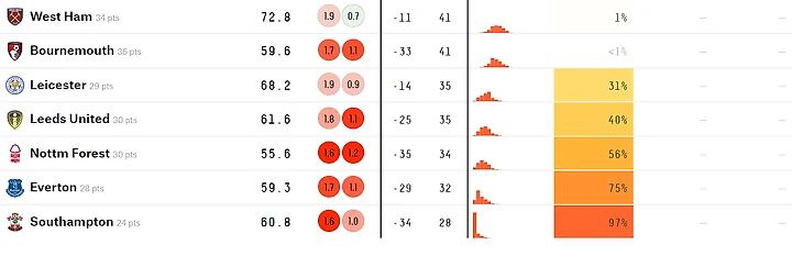 Самая большая борьба за право остаться в АПЛ. В «Саутгемптон» бездушная машина совсем не верит и отправляет его прямиком в чемпионшип уже сейчас. «Лидс» и «Лестер» готовы спастись, а попрощаемся мы с «Форест» и «Эвертоном».
