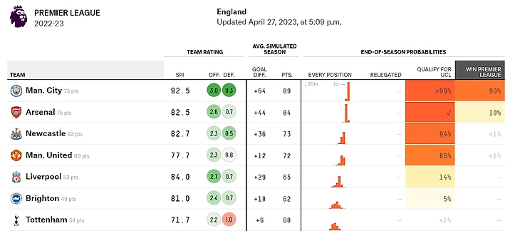 Суперкомпьютер проанализировал все результаты 33 тура и пришел к неутешительным для болельщиков «Арсенала» и «Ливерпуля» выводам: «Сити» станет чемпионом с вероятностью в 90%, а на то, что «Ливерпуль» будет в четверке он дает всего 14%. Для сравнения «Юнайтед», который как раз займет последнюю из квалификационных в ЛЧ позицию, вероятность попадания в этот еврокубок − 86%.