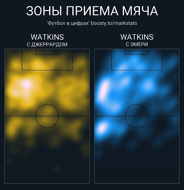 Тепловая карта подкрепляет слова Уоткинса: с Джеррардом у него была большая вовлеченность, он действовал по всей ширине поля с некоторым перекосом в сторону левого фланга. С Эмери смещения налево стали акцентированнее.