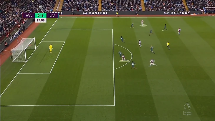 Уоткинс располагается в зоне левого полуфланга, между Трентом и Матипом. Он так и продолжит двигаться по ходу развития атаки.