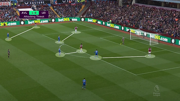 «Астон Вилла» ведет в счете и продолжает коротко разыгрывать мяч, выманивая соперника в прессинг. «Лестер» встречает высоко с персональными ориентировками. Мартинес отдает передачу по центру на Камара, по которому играет Дьюзбери-Холл.