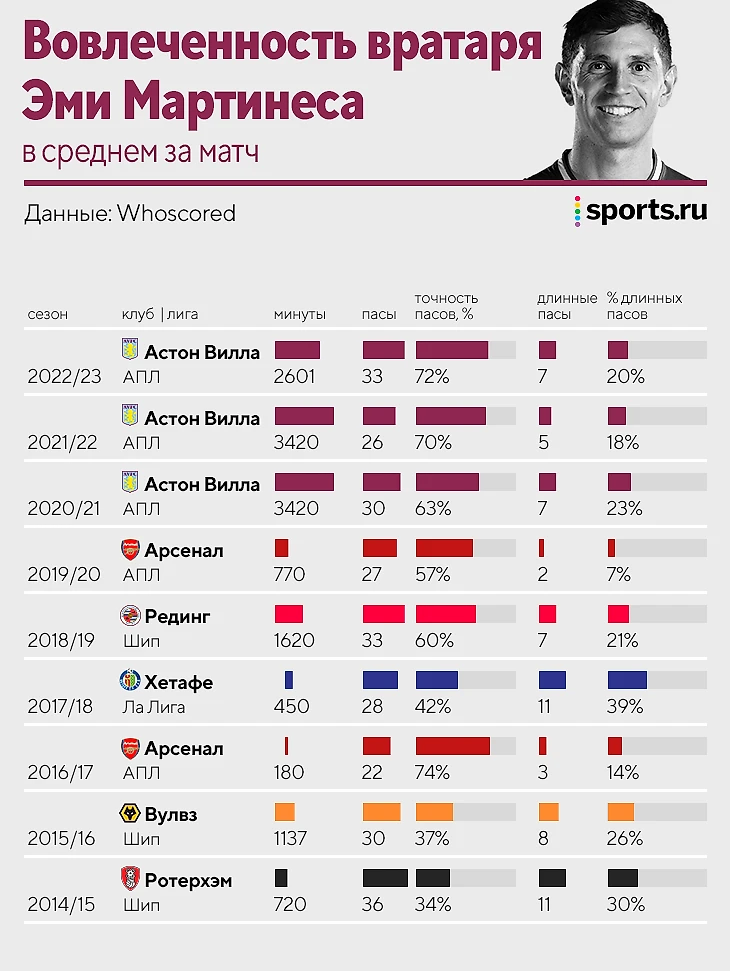 Неотъемлемый элемент розыгрышей «Астон Виллы» – вовлеченность вратаря. Эми Мартинеса стабильно подключают в начальной стадии – это позволяет спровоцировать прессинг, и именно вратарь выступает дополнительным игроком, который помогает пройти давление и направляет атаку. Он расположен лицом к полю и видит расположение партнеров. Поэтому критически важен вратарь, который хорошо играет ногами. У Мартинеса получается значительно лучше и по сравнению с прошлыми сезонами, и на фоне Ольсена. В нынешнем сезоне у Эмилиано пиковоое количество передач в среднем за игру, лучшая точность передач (если считать в высших дивизионах). Количество длинных передач выросло по сравнению с прошлым сезоном, но оно не настолько высокое, как было в более прямолинейных командах.