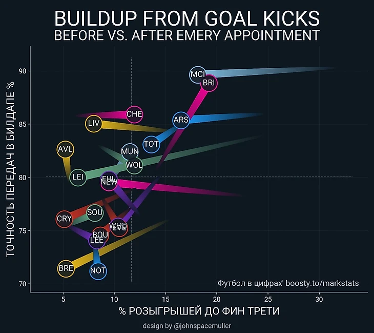 График показывает, как изменился розыгрыш мяча от вратаря. При Эмери выросла точность передач в начальной фазе (с 80% до 82,6%), но при этом меньший процент розыгрышей стал доходить до финальной трети. Это больше стилистический показатель, который демонстрирует, что на мяче «Вилла» стремится к большему контролю.
