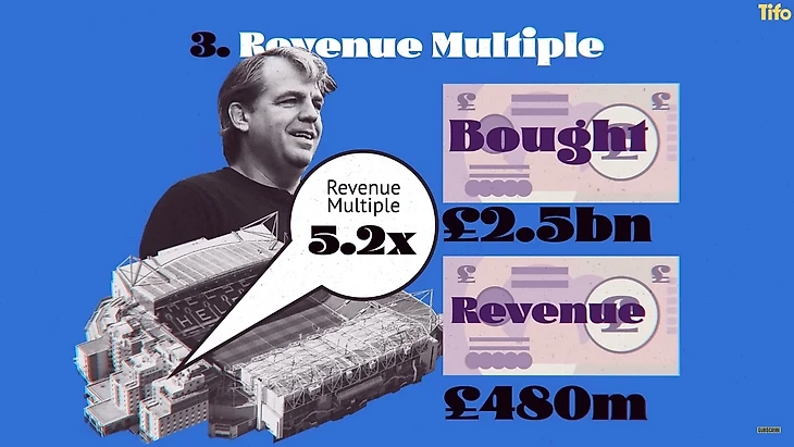 В качестве примера можно рассмотреть недавнюю продажу "Челси". Так, "Челси" был куплен за 2,5 миллиарда фунтов стерлингов и, согласно недавно опубликованным финансовым отчетам, его доход в 2021-22 годах составил около 480 миллионов фунтов стерлингов.