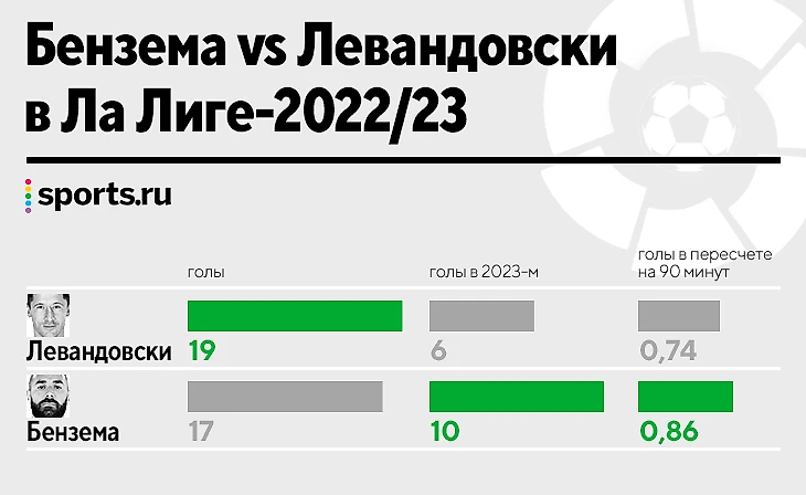 Первая часть сезона больше удалась Левандовскому: 13 мячей в 15 матчах, он был лучшим бомбардиром чемпионата к паузе. Бензема там провел в два раза меньше матчей, хотя был так же эффективен: 7 мячей в 8 играх. После паузы на чемпионат мира и полноценного восстановления от травмы Карим мощнее: 10 голов в 12 играх, у Левандовского 6 в 13 матчах.