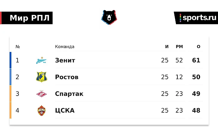 «Ростов» после ничьей со «Спартаком» уступает «Зениту» 11 очков, «Спартак» – 12, ЦСКА – 13. Больше ни у кого не осталось даже математических шансов догнать «Зенит».