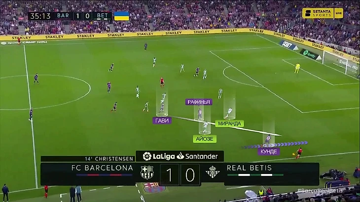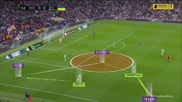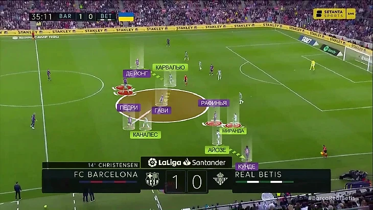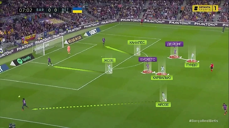 На самом деле эта проблема начала прослеживаться сразу – со стадии прессинга гостей против розыгрышей хозяев. Структура давления «Бетиса» была следующей: Каналес вместе с Жозе давили на Кристенсена и Араухо, Айозе находился в узкой позиции и готов был начать давление на Кунде, а Гуидо и Карвалью играли по опорникам «Барсы»: