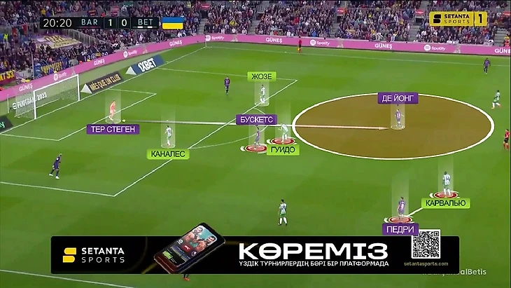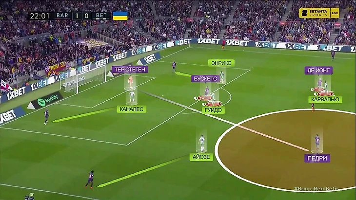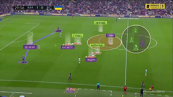 Кстати говоря, второй гол «Барселоны» хоть и был уже забит в игре 11 на 10, всё равно исходит из всё той же проблемы «зелёно-белых». В центре поля Карвалью разрывается между де Йонгом и Гави и в итоге второй получает пас и затем даёт предголевую на Кунде: