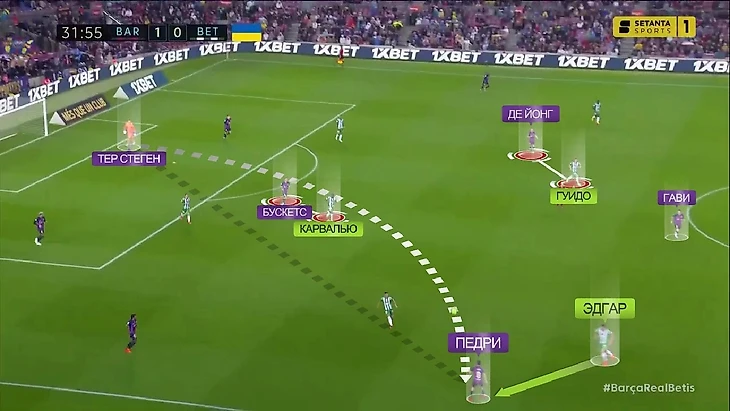 Но уже через двадцать секунд примерно такой же трюк хотел провернуть Эдгар, но для «Бетиса» это закончилось плачевно. Мы видим, что Карвалью и Гуидо разобрали Бускетса и де Йонга и у тер Стегена есть вариант с пасом на Гави или Педри. У Гави Пеццелья перехватил мяч буквально только что и Марк решил попробовать сделать длинный пас на Педри. На него выдвинулся Эдгар, у которого уже было предупреждение, но был обыгран и сфолил на вторую жёлтую: