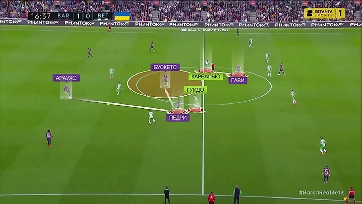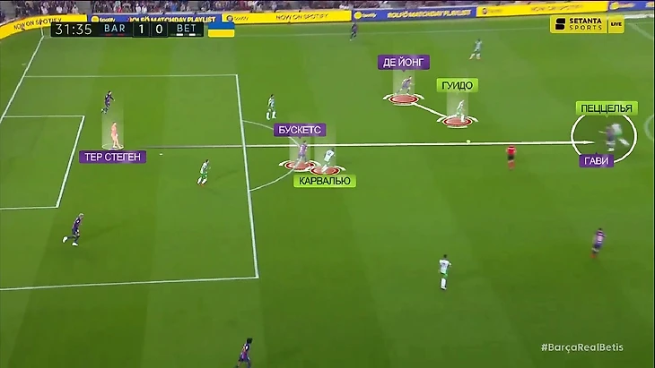 На самом деле после первых минут двадцати мы увидели попытки защитников гостей агрессивно выходить из линии и накрывать свободного игрока. В этом моменте мы видим классическую ситуацию в этом матче: Карвалью и Гуидо давят на де Йонга и Бускетса, а Педри остаётся свободным: