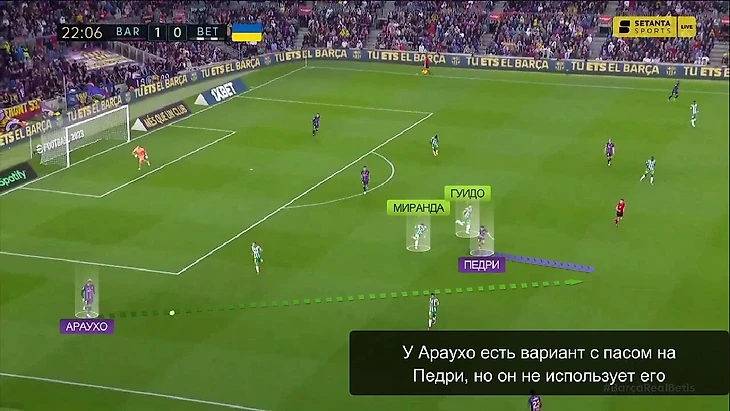 Но Хуан не успел отобрать мяч у Педри и был отыгран. У Араухо была возможность дать пас на ход, но он ей не воспользовался: