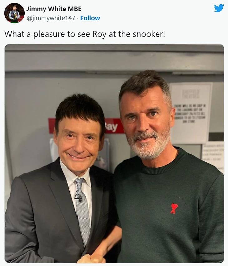 Однако футбольных болельщиков взволновало не то, что происходило на снукерном столе, а то, что было за его пределами. В коридорах Крусибла Рой Кин встретился с шестикратным финалистом чемпионатов мира по снукеру, легендой Джимми Уайтом.