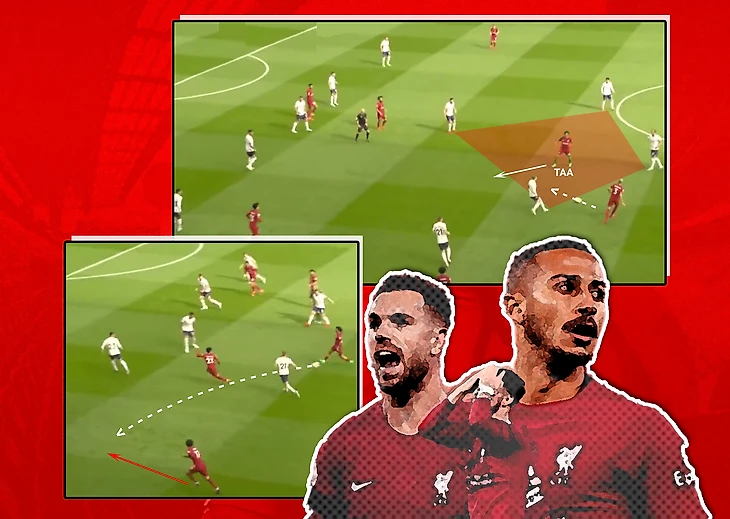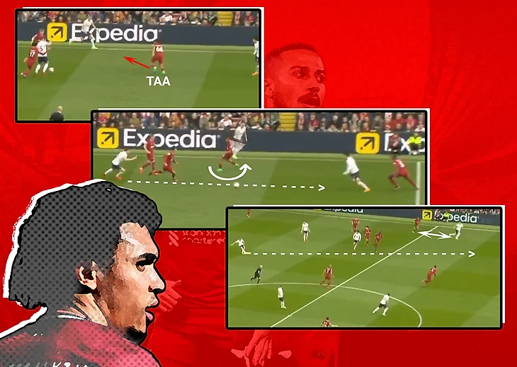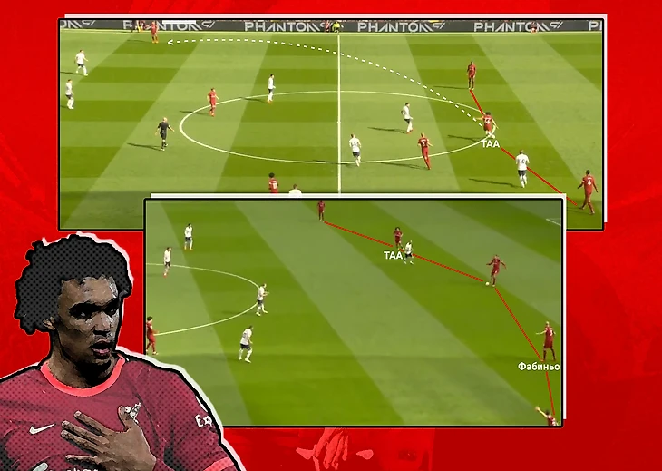 ТАА часто занимал равноудаленные от соперников позиции и заранее продумывал дальнейшие действия. Например здесь, англичанин открывается внутри построений «Тоттенхэма», получает передачу и сразу же двигает его в свободную зону, после чего отдает передачу на фланг: