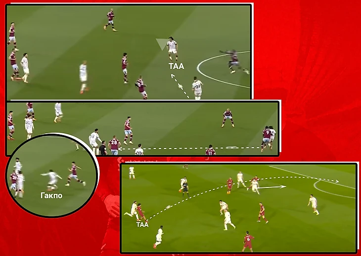 Свою пользу в полузащите Трент подкрепляет статистикой - отдает голевые передачи из центральной зоны. Например, пострадали «Вест Хэм» и «Лидс». ТАА, находясь рядом с центральным кругом, вертикальными передачами награждает открывания Гакпо. Против «молотобойцев» разрезающий пас низом, против «павлинов» заброс за спины защитников: