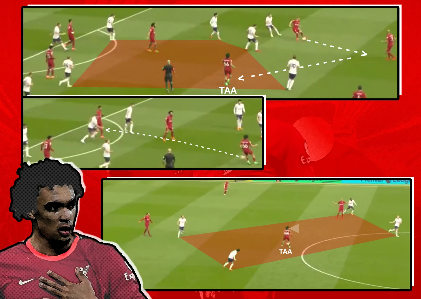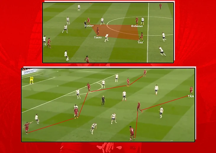 Александр-Арнольд не плохо смотрелся в данной структуре. Он получал продвигающие передачи от защитников, а после сам двигал мяч вперед за счёт дриблинга и пасов вперед или на фланг. Подробнее ниже. Перед оборонительным блоком соперника Трент помогал паре центральных защитников разыгрывать мяч в первой стадии. Создавая численное преимущество над нападающими «Тоттенхэма», англичанин разворачивал атаки или выполнял некоторые функции Ван Дейка, например, снабжал диагональными передачами забегания Салаха. Иногда помощь защитникам со стороны пары опорных была не рациональной. Был эпизод, когда перед Харри Кейном выстраивалась линия из пяти человек в красном, что конечно бьёт по скорости и качеству продвижения мяча: