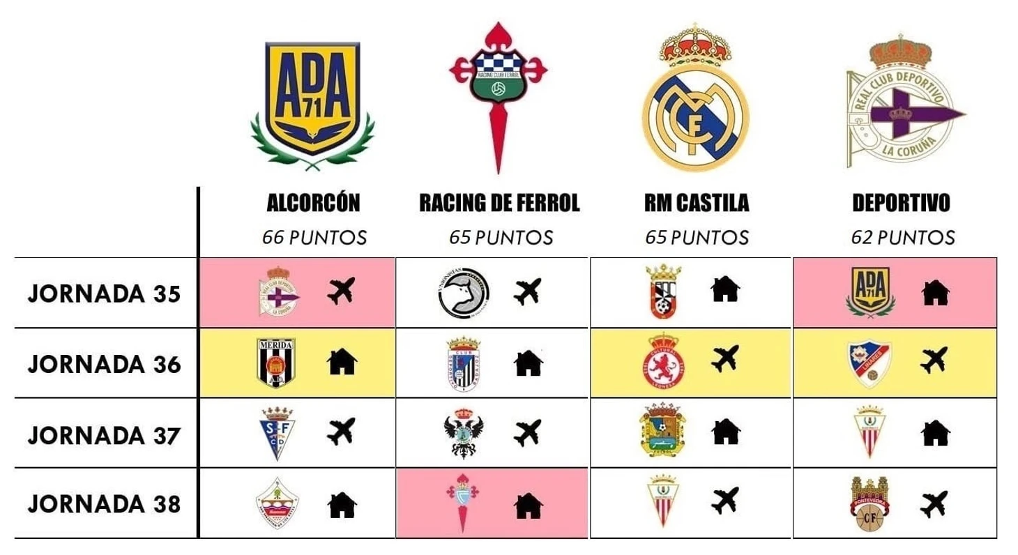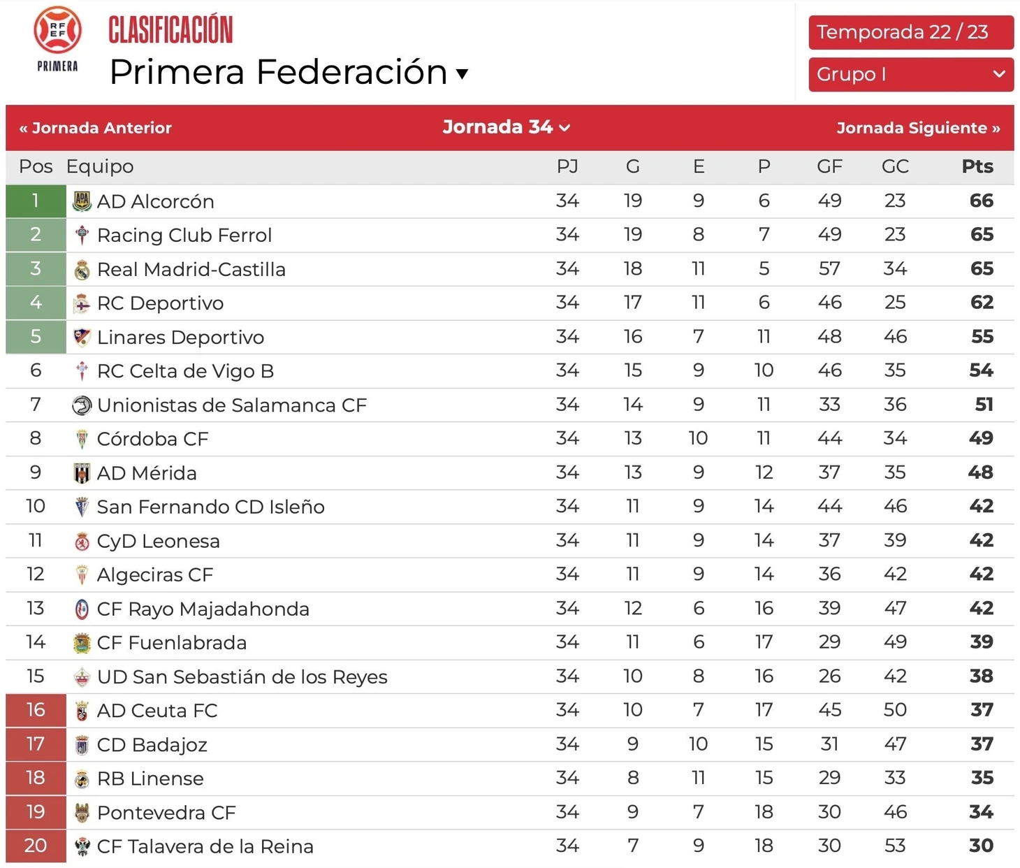 В среду Кордоба 1-2 Ферроль сыграли перенесенный матч, по регламенту первенства при равенстве очков в расчет берутся личные встречи: по ним Кастилья имеет отрицательную статистику с Алькорконом и Ферролем, но положительную с Депортиво. Таким образом, уповать приходится лишь на набранные очки.