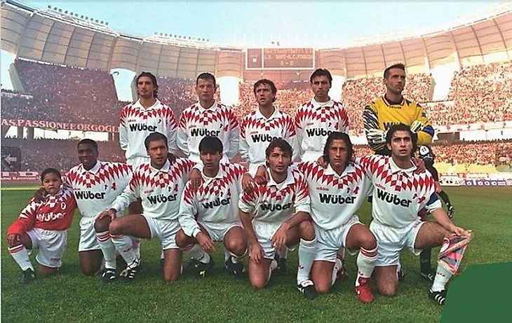 На третьей форме «Бари» этого сезона не человеческая многоножка и не очередная фантазия нейросетей, а отсылка к легендарному для маленького клуба празднованию гола в громкой победе…не в финале какого-нибудь турнира, а просто в гостях над миланским «Интером» – впрочем, весьма грозным по меркам южан соперником.