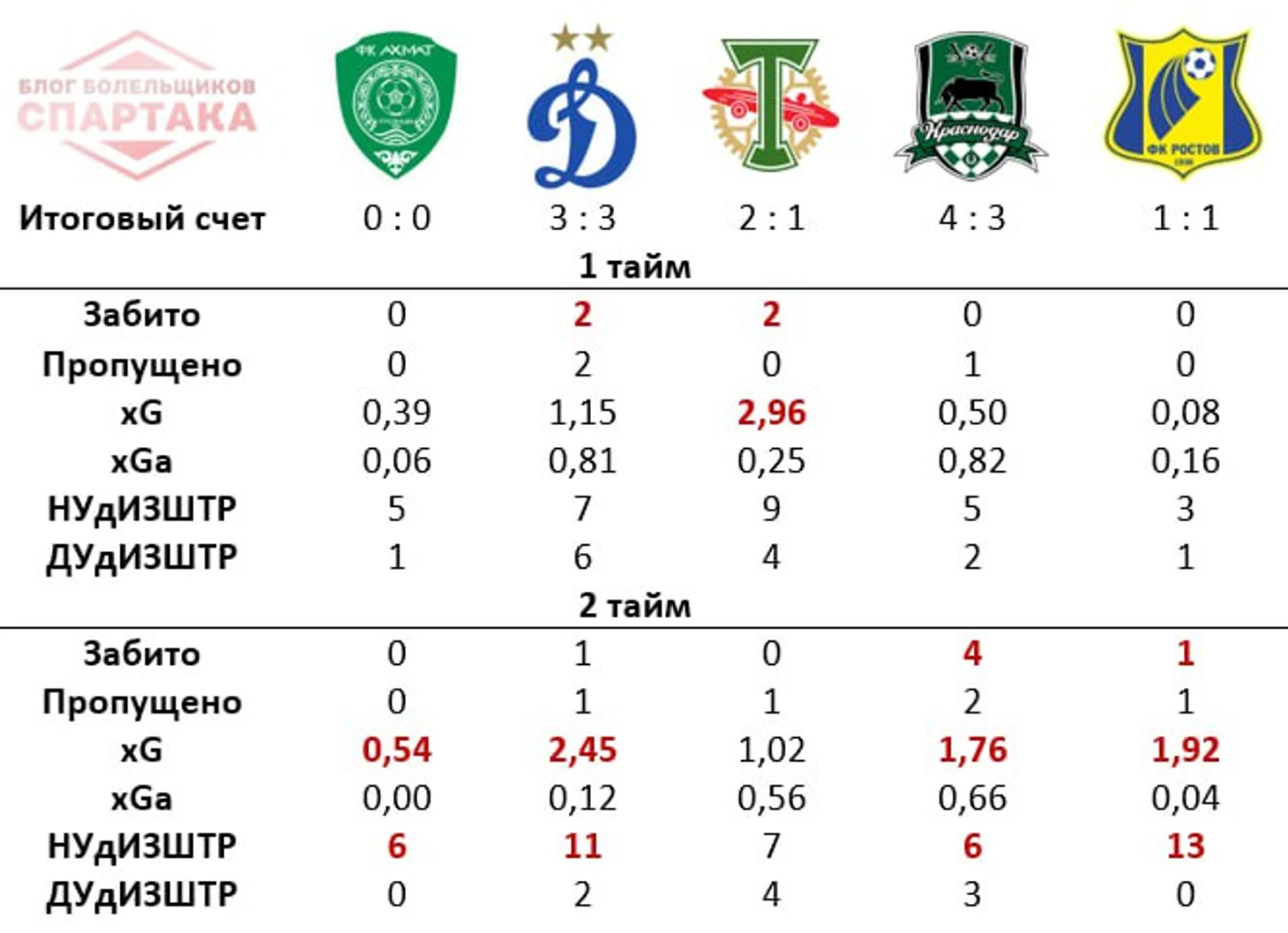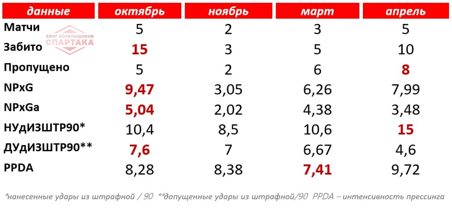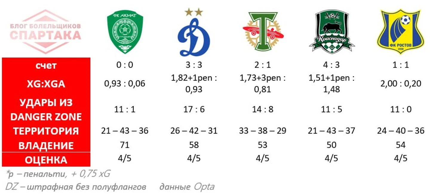 Впервые в сезоне красно-белые нанесли 10+ ударов из штрафной (без полуфлангов) в 5 турах подряд. Превзошли соперников по ожидаемым голам (xG). Контролировали территорию. Больше владели мячом.