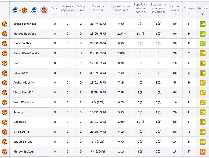 Оценки игроков «МЮ» за матч против «Брайтона» от Sofascore